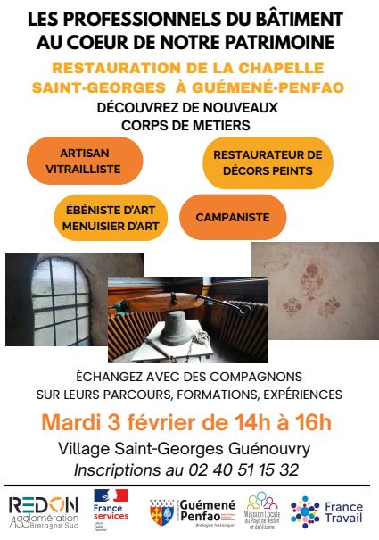Les métiers du bâtiment vous intéressent…alors, venez à la rencontre des professionnels qui restaurent la chapelle Saint-Georges à Guénouvry le mardi 3 février de 14h à 16h.